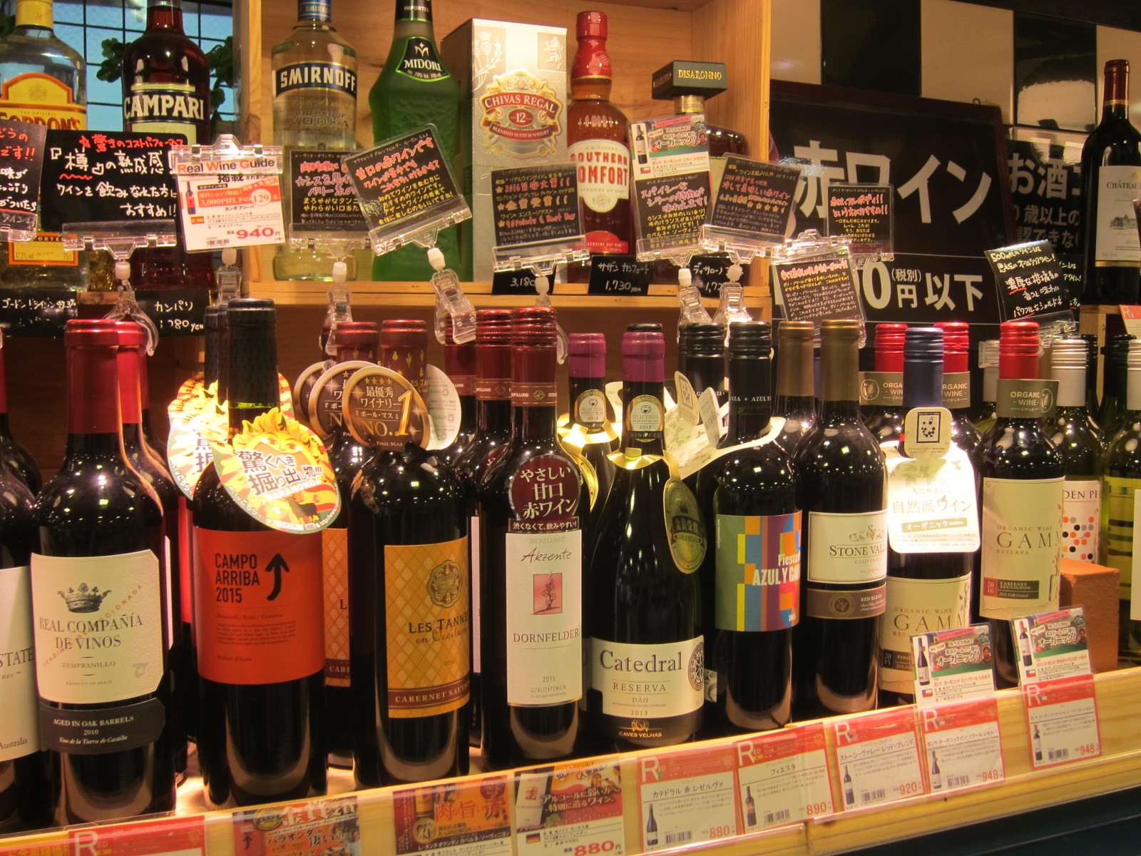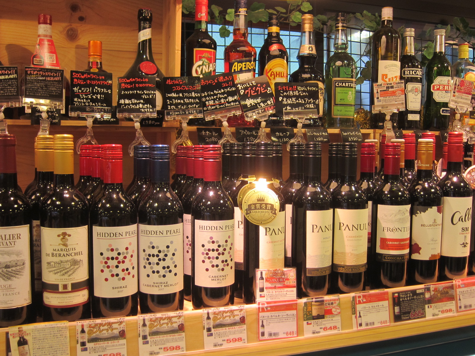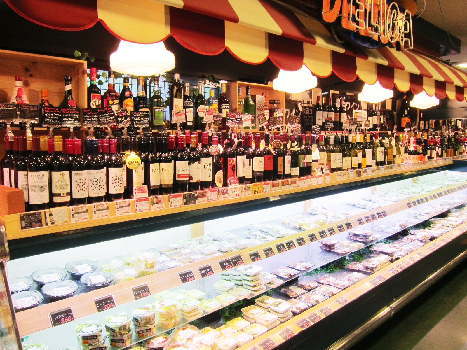 惣菜の冷蔵ケースの上にワインを陳列しています。本当は木箱でボリューム感を出して販売したいのですが、小さいスーパーなのでスペースがありません。空いているスペースを有効活用します。最初はなかなか売れませんでしたが、1000円以下のワインの品揃えを充実させ、すべてのワインにPOPをつけてから、売れるようになってきました。1000円以上のワインは向かいの陳列棚にあります。