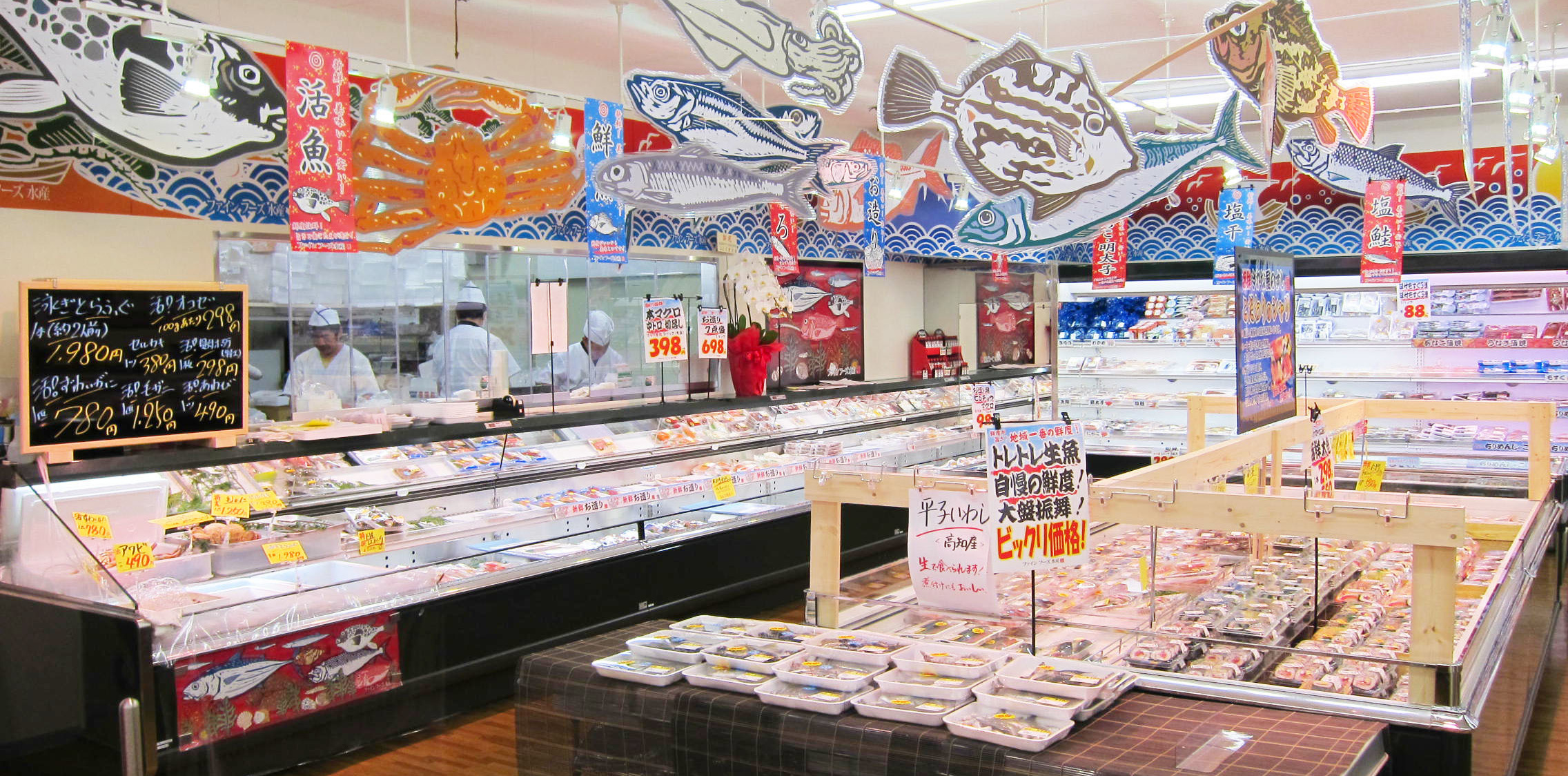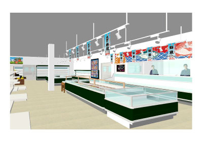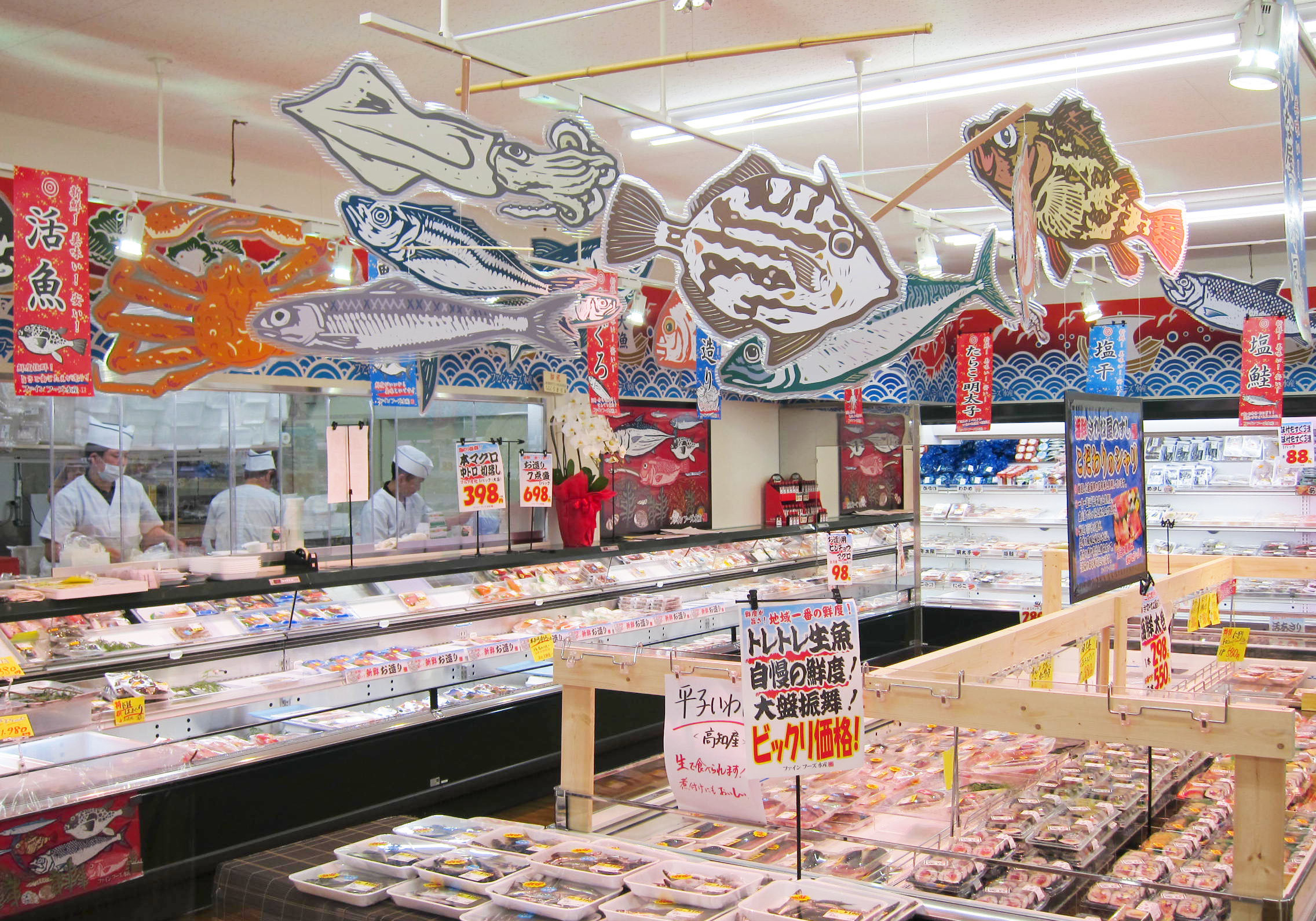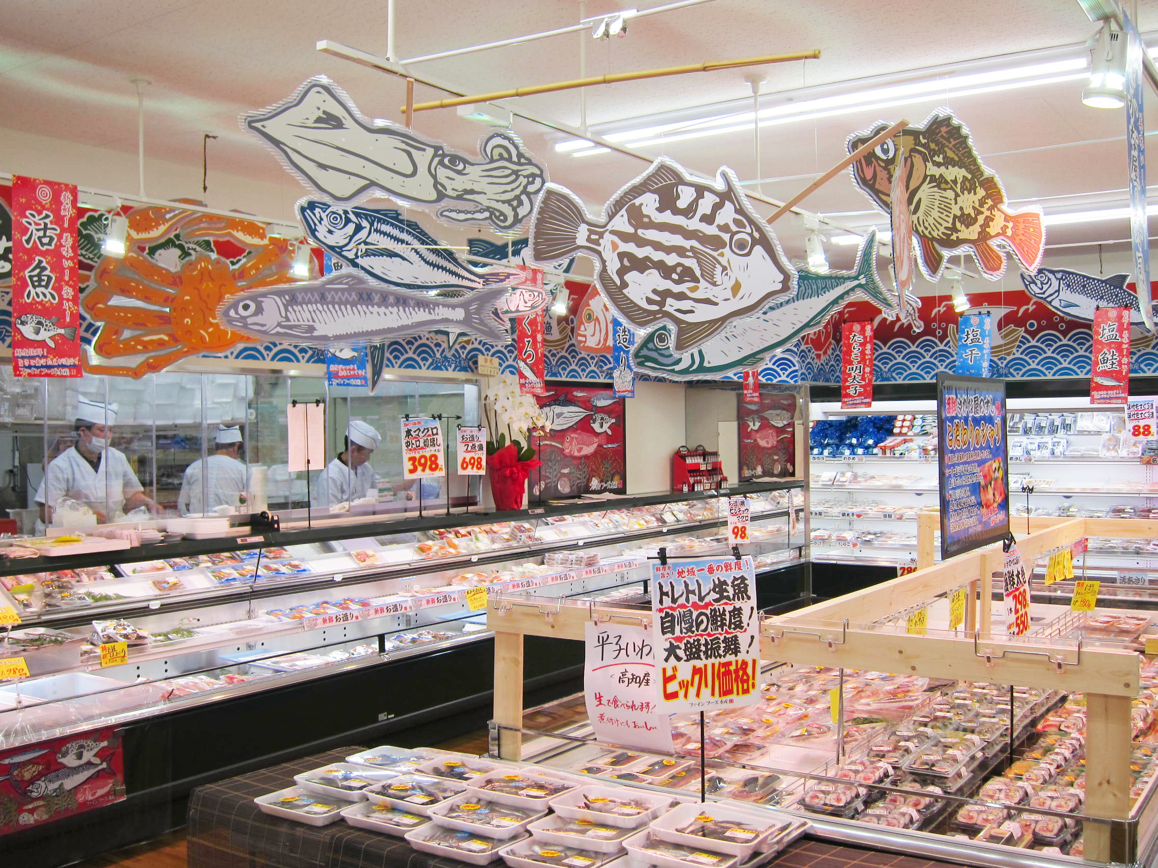 壁面には、デザイン出力した防炎布を貼り、魚のディスプレイを天井から吊るしています。建築工事で造作を作るよりもかなり安価に、店内の雰囲気をつくりだすことができます。