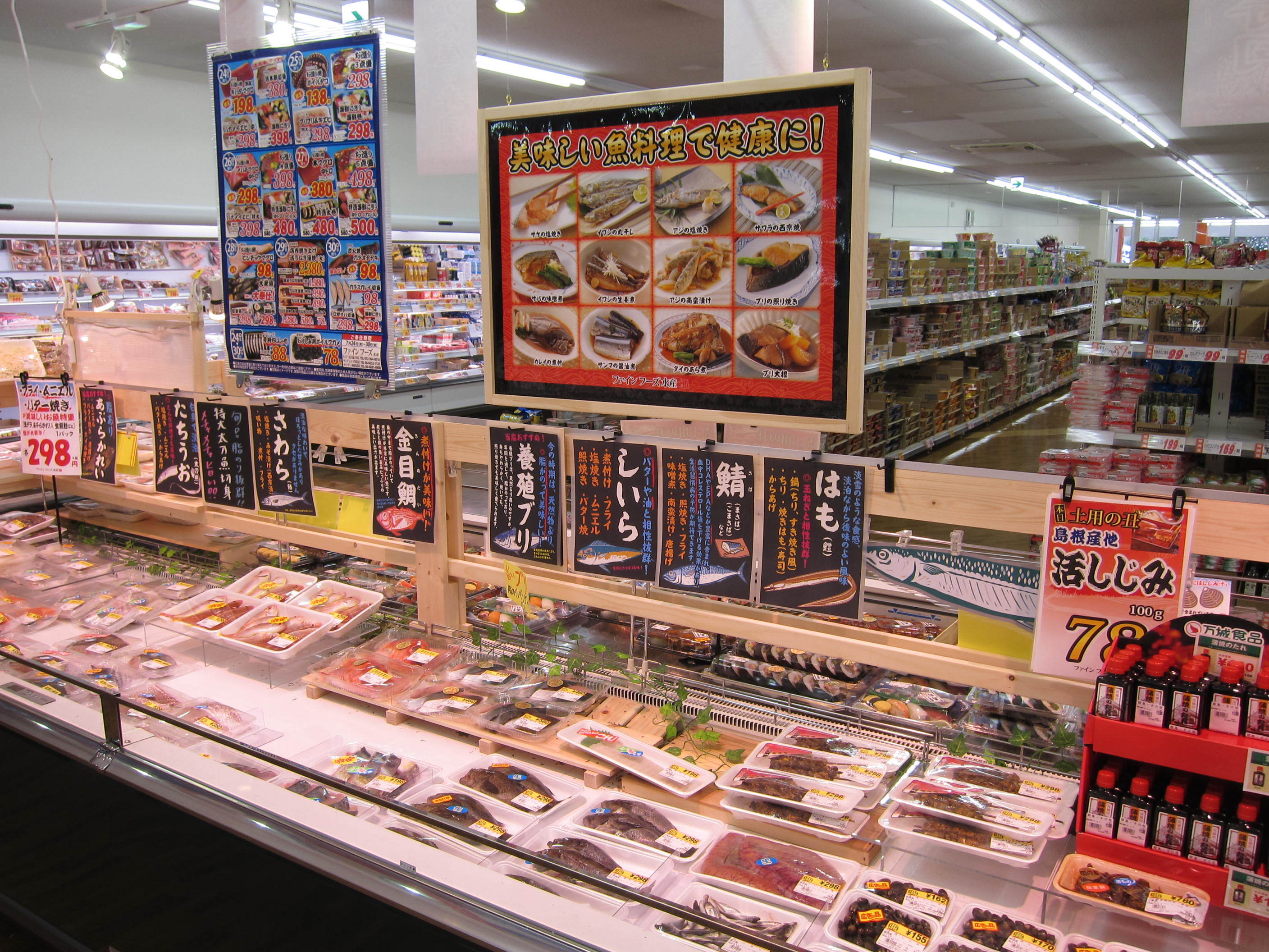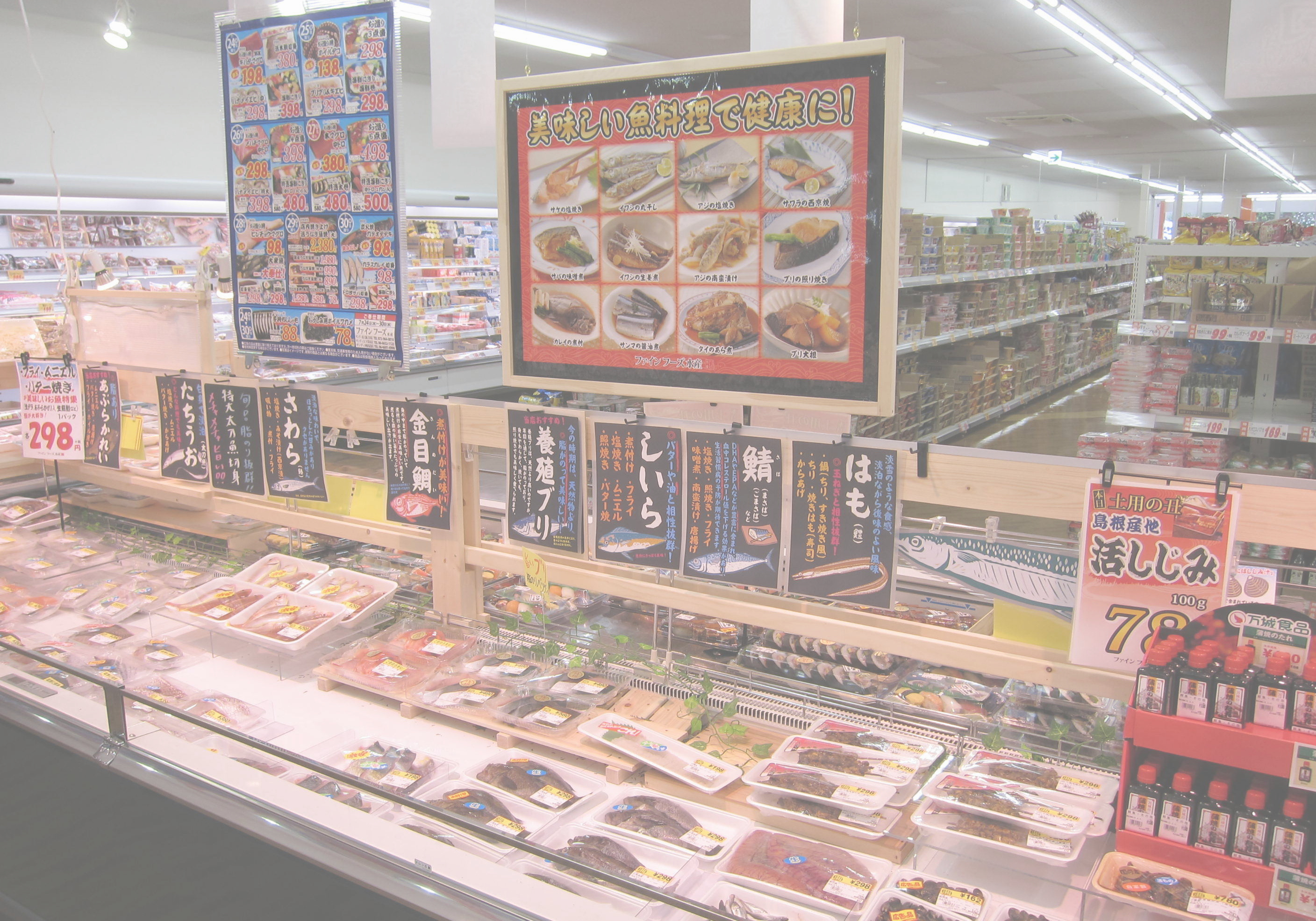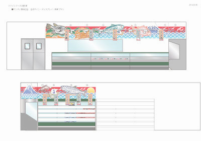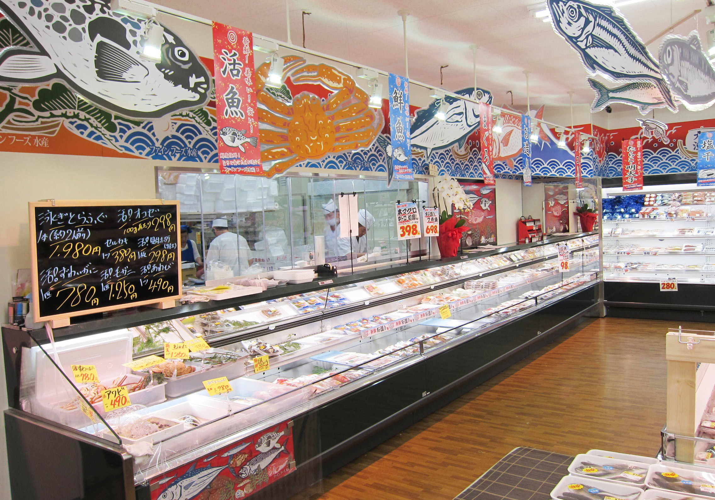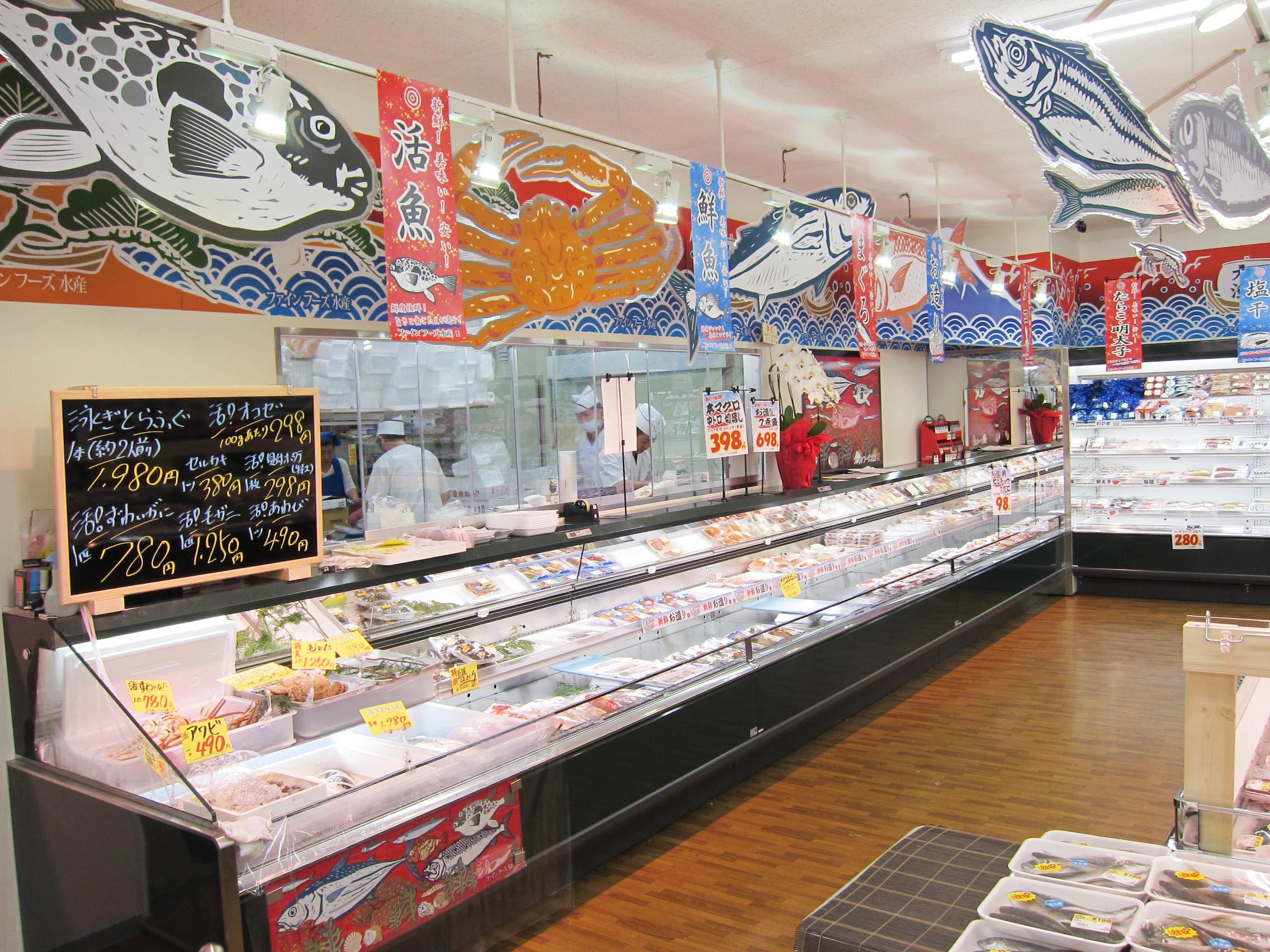壁面には、デザイン出力した防炎布を貼り、魚のディスプレイを天井から吊るしています。建築工事で造作を作るよりもかなり安価に、店内の雰囲気をつくりだすことができます。