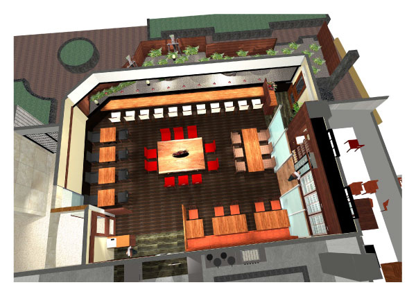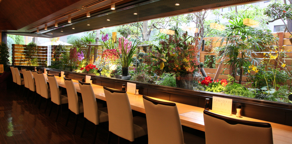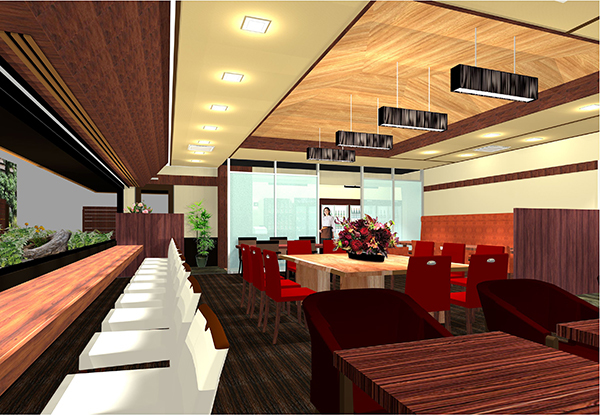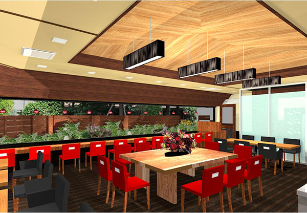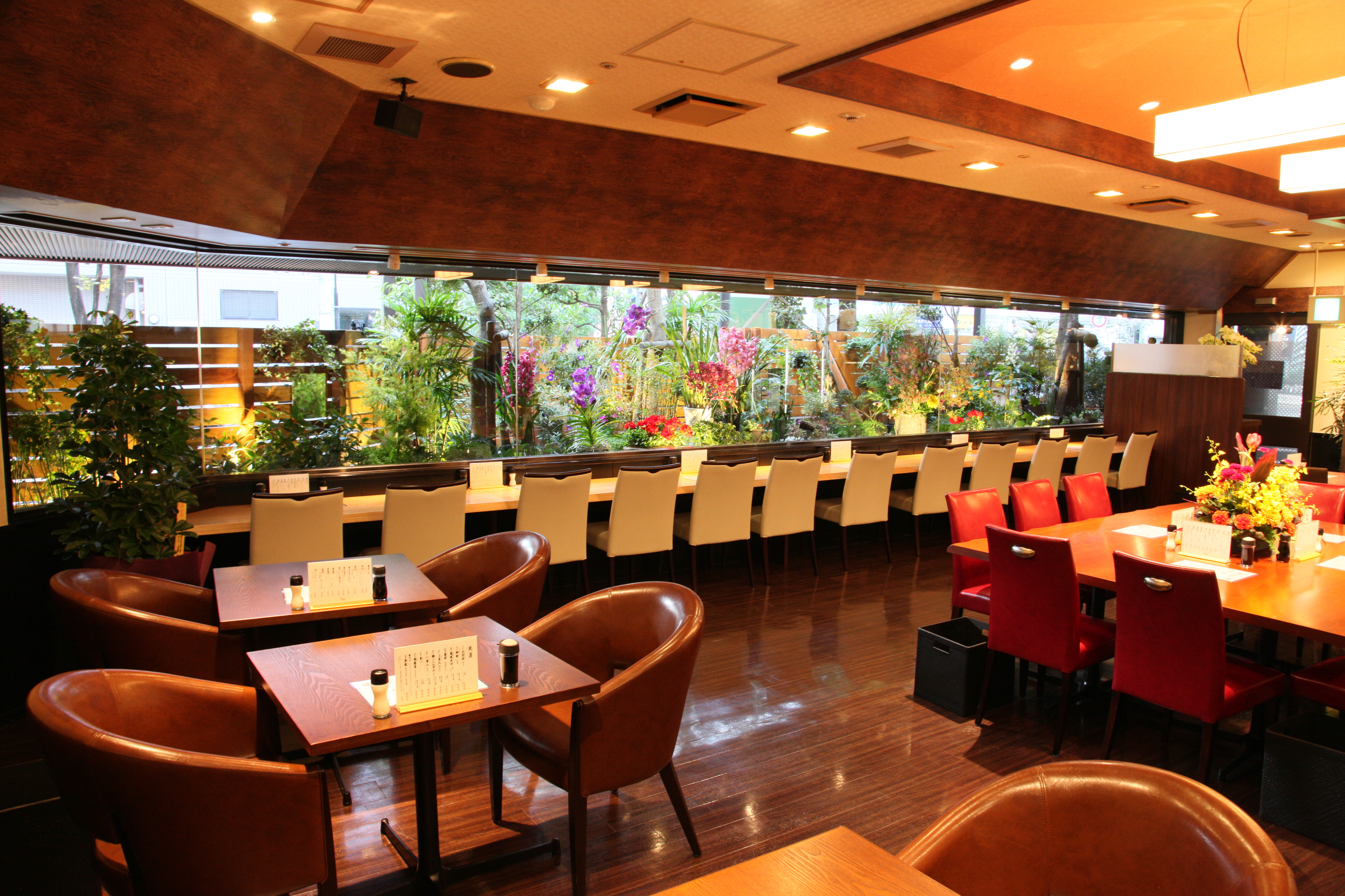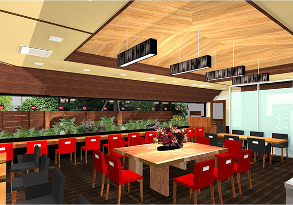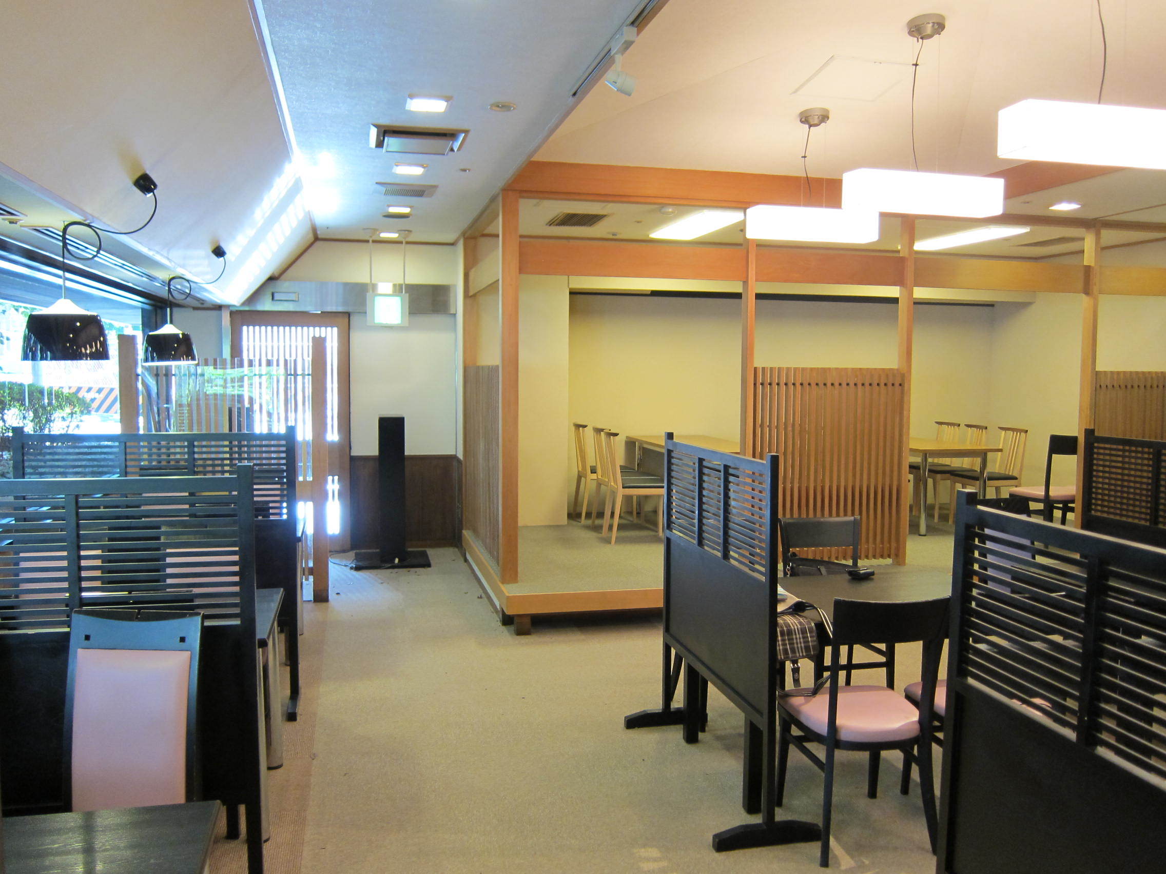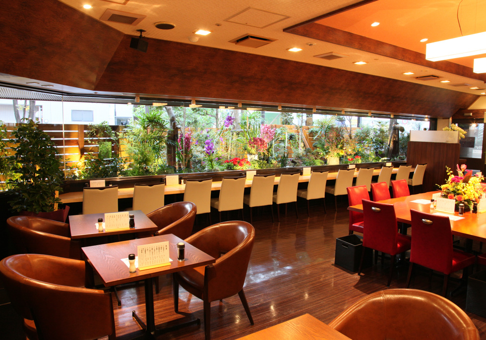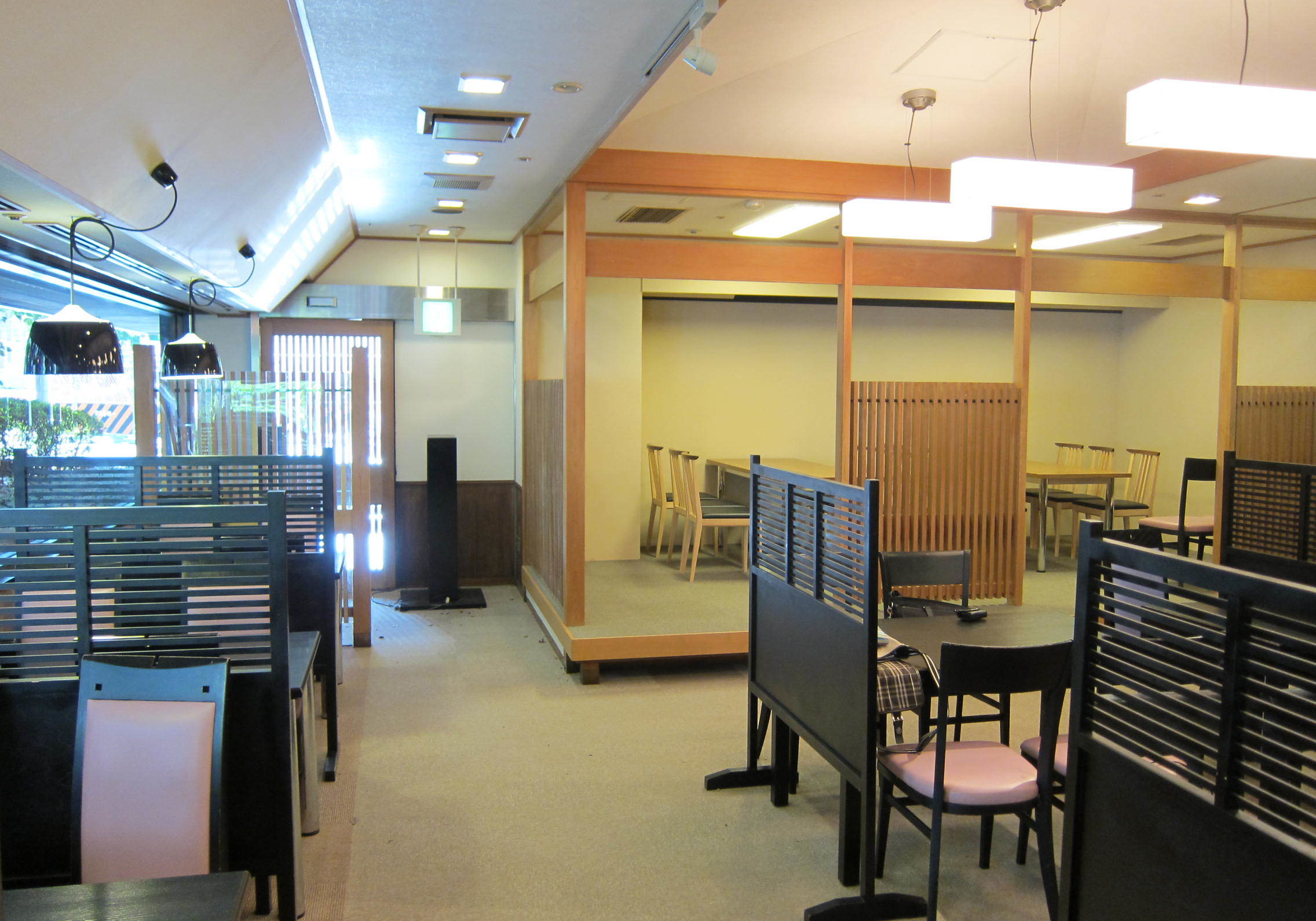 会議室や結婚式場などがある大きな施設の1階にあります。大宴会に対応できる大きな厨房が特徴の物件でした。立地があまりよくないので、店舗としては庭を特徴として打ち出す店となりました。イメージは大きく変わりました。